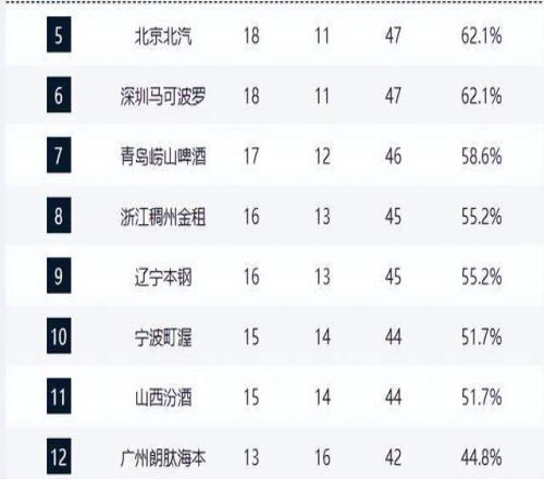 青岛队(17胜12负)与浙江队(16胜13负)分列第七、第八,季后赛门槛清晰可见。宁波队(15胜14负)与山西队(15胜14负)同分,位列第十、十一,竞争激烈。广州队(13胜16负)以微弱优势守住第十二位,成为季后赛“守门员”。北控、福建、新疆、吉林等队仍存理论晋级希望,竞争格局高度开放。