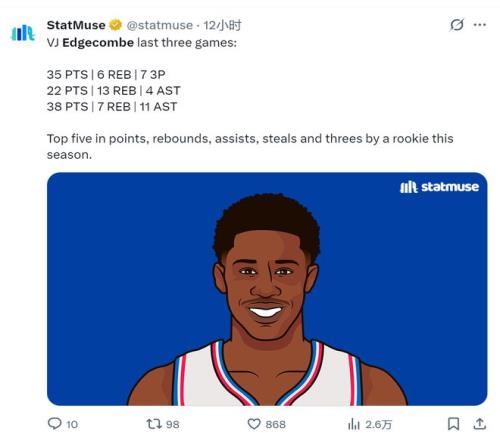 三场数据单分别是:38分7板11助、35分6板4助、22分13板4助。打雷霆那场35分,他全场0罚球——本赛季唯一一个0罚球还能砍下35+的球员。这效率,这出手选择,你跟我说他是个新秀?