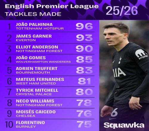 北京时间3月24日,知名数据机构Squawka统计出了本赛季至今英超成功抢断次数最多的10名球员,帕利尼亚96次第1,詹...